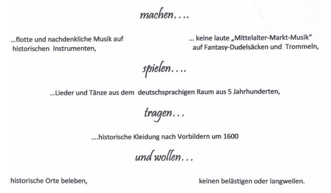Möchten Sie einmal kurz in unsere Musik hineinhören? Wir haben einige Ausschnitte für Sie zusammengestellt: Alleweyl (nach Valentin Rathgeber (1682-1750)) Wär ich ein wilder Falke (J.H. Reichardt 1777 / trad.) Alter Tanz (traditionell) Unser liebe Frauen (trad./trad aus Georg Forsters Frische Teutsche Liedlein 1556) Tanzende Hose (trad.) Ade zur guten Nacht (traditionell Franken/ Thüringen) Oder möchten Sie sich lieber einen Ausschnitt aus einem unserer Auftritte ansehen? Dann wählen Sie bitte eines dieser Videos: Reigen (nach Tielmann Susato (1510/15- 1570)) Alleweyl (nach Valentin Rathgeber (1682-1750))